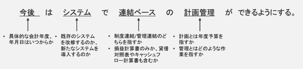 「実績」、「計画」、「経営管理」、「管理会計」など、一般的に使用される専門用語は、シチュエーションによってその意味する内容はさまざまです。にもかかわらず、このような単語はそのまま使用しても会話が成立するため、その内容について深く考えていなくとも、また参加者間で具体的な認識合わせをおこなわなくとも(認識がずれたままでも)議論が進んでしまうことがよくあります。その結果、あとになってから各人の理解がずれていることが明らかになり、作業に多大な手戻りが生じるおそれがあるため、十分に注意する必要があります。